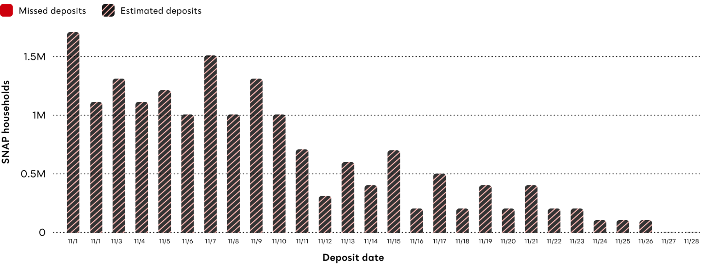 SNAP deposit dates vary by state: some arrive on the 1st, others on the 2nd, and beyond. This staggered schedule means millions of families wait each day for the benefits they need to buy food. Our data from over 5 million households reveals how many November deposits—and meals—families are still waiting for each day.