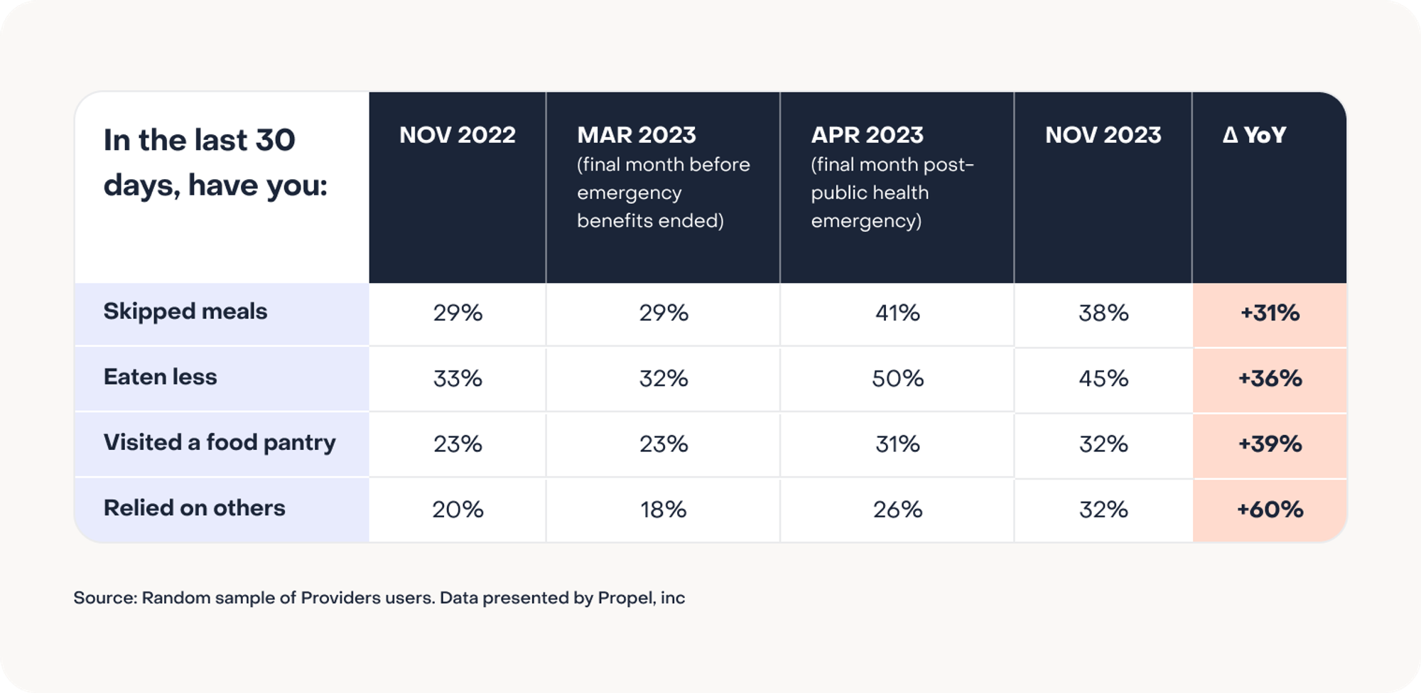 The following insights come from a <10-minute multiple choice and open response survey conducted by Propel. This month, responses came from 3,037 randomly selected households out of over 5M Propel users from November 1 - November 14, 2023. All respondents are EBT cardholders.