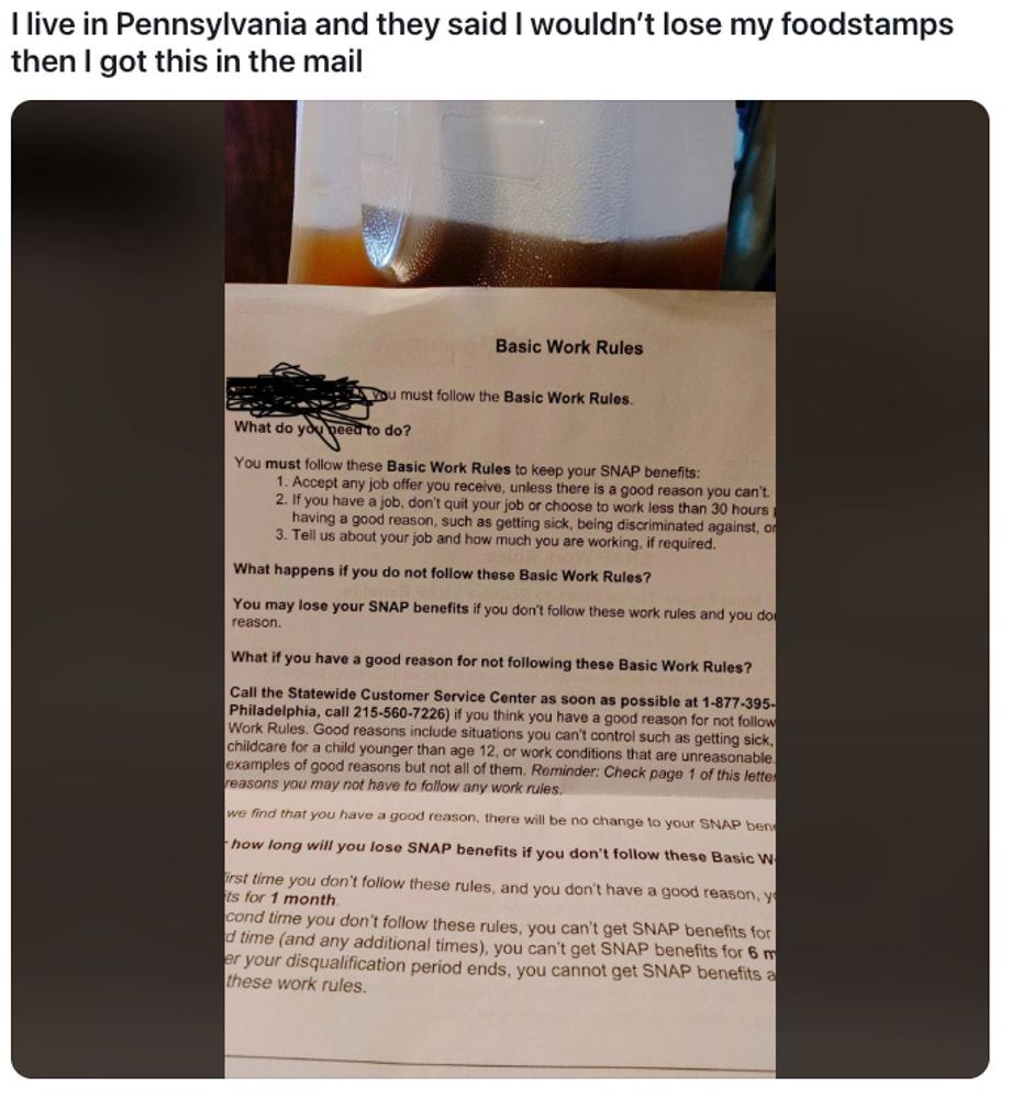 Here’s an example of someone who thought they were losing their SNAP after receiving this notice, so they posted online. Specifically they thought their SNAP would be taken away if they didn’t get a job immediately.