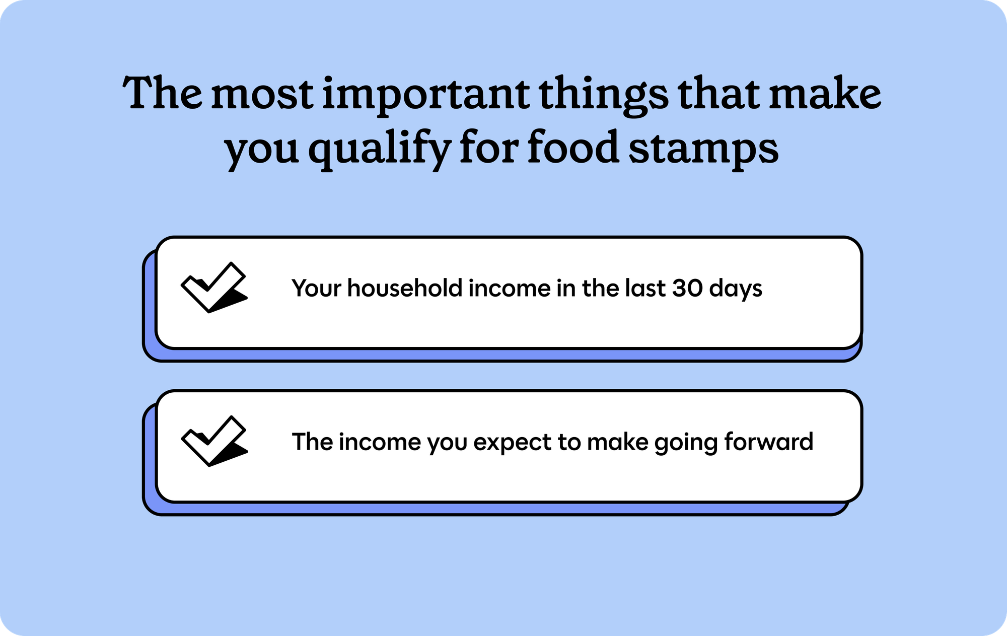 It’s important to know that food stamp eligibility is mostly about income: money you expect to get every month.