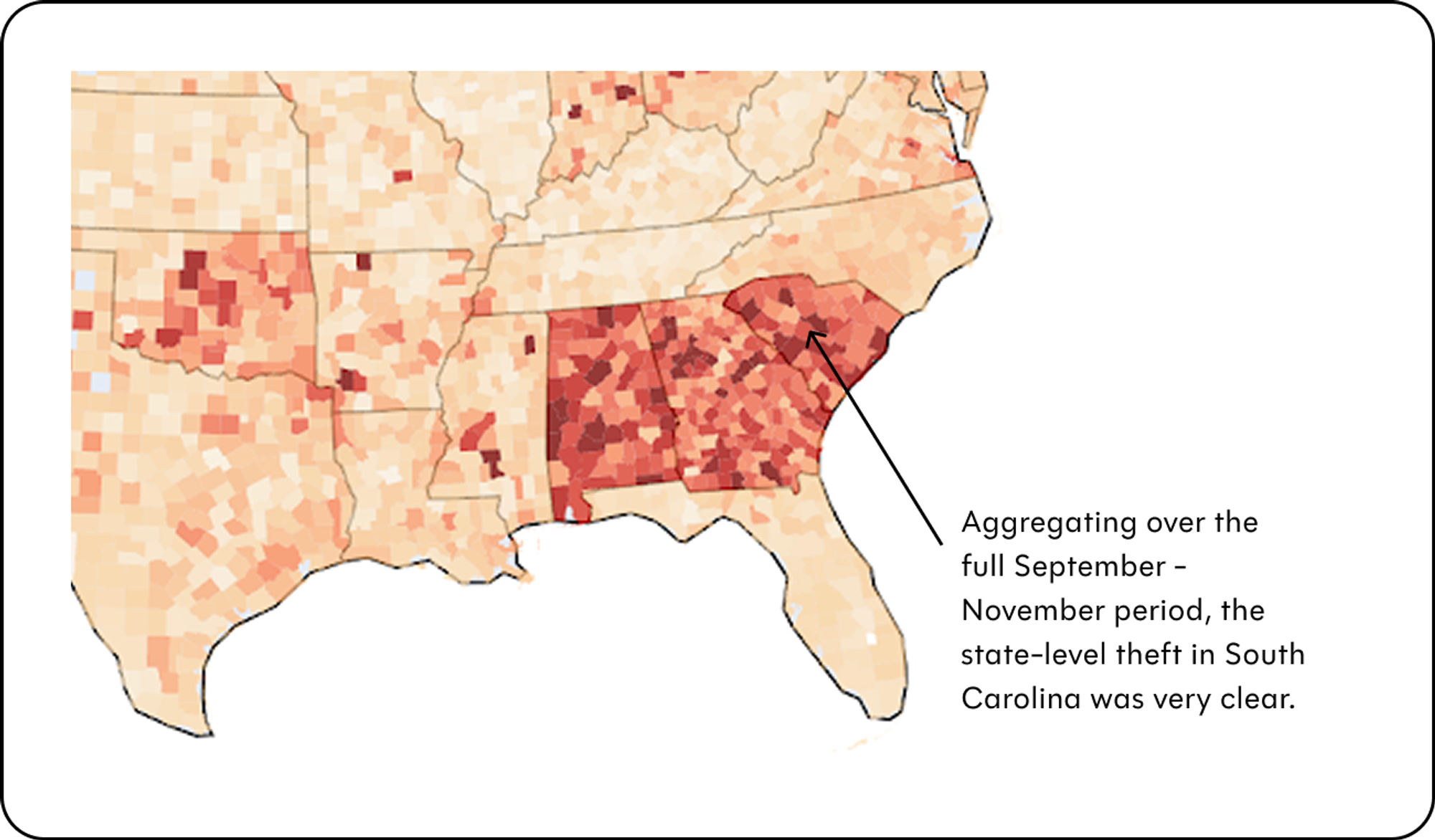Sharp boundaries emerging at the South Carolina state border in our most recent data analysis suggests a different vector of EBT theft, one that is not tied to skimmers. We saw a similar pattern in fall 2024.