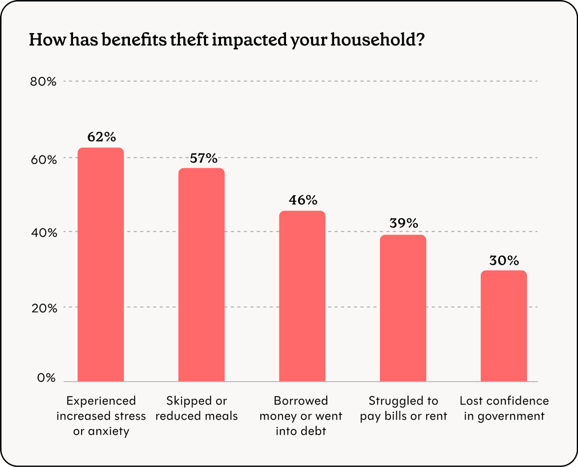 - 39% reported struggling to pay bills or rent