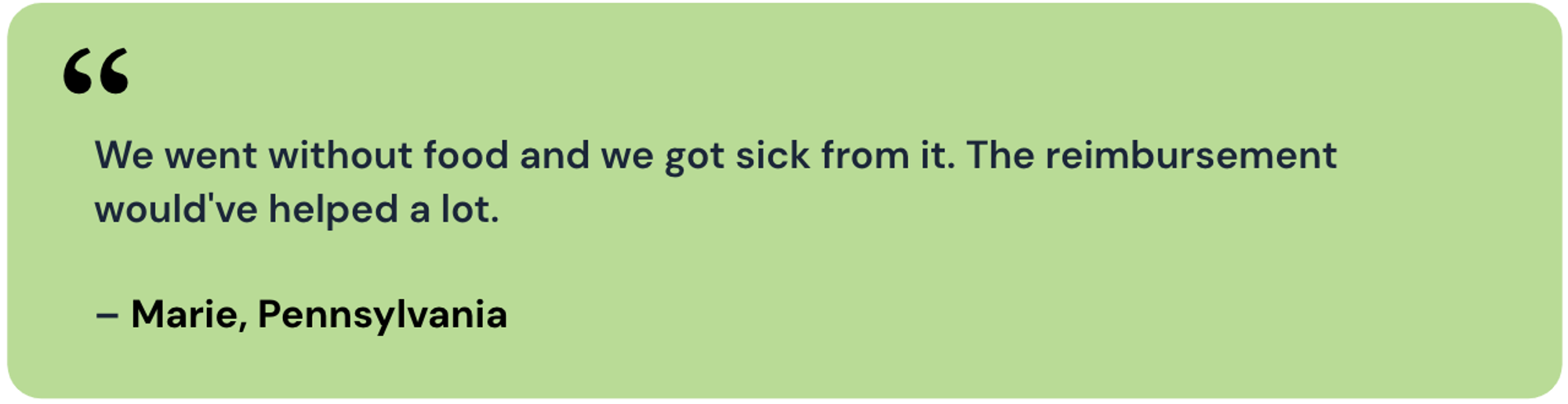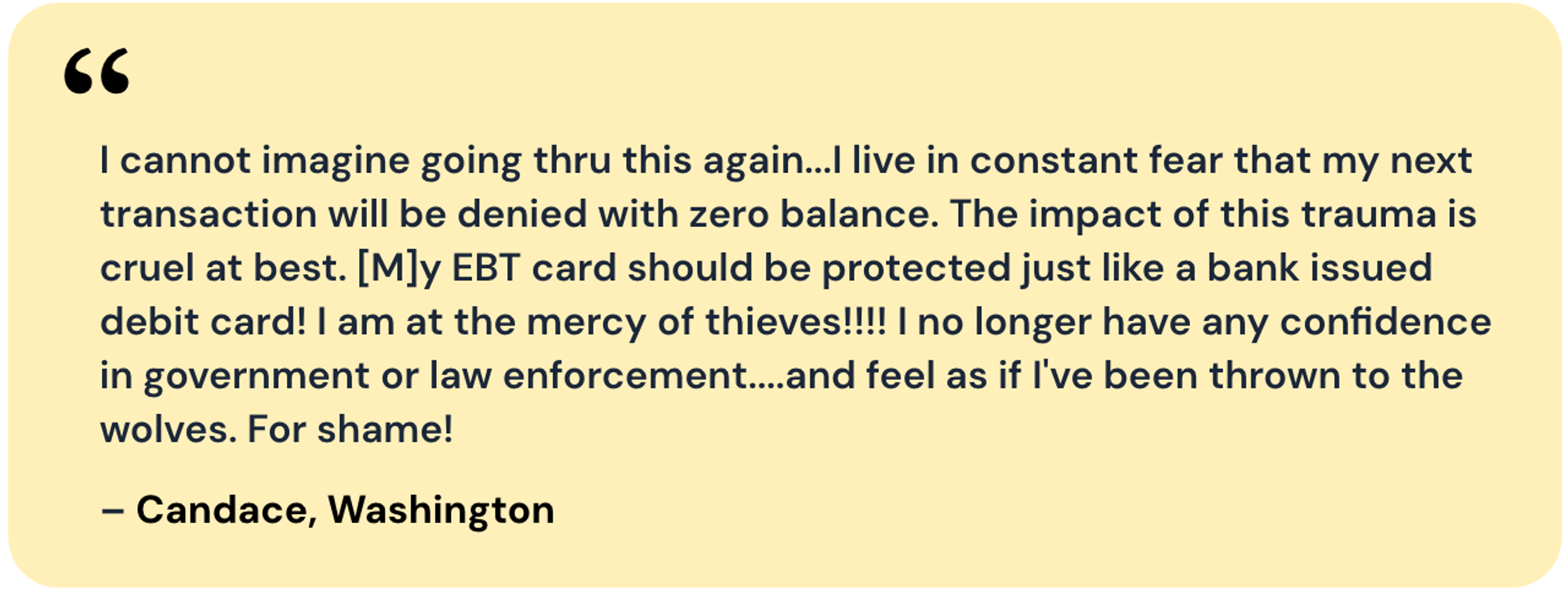 | “I would like Congress to reconsider opening back up the program to replace benefits stolen. It would be unfair for my family to suffer from not having my benefits because they were stolen and can't be reimbursed. This would totally not be my fault that they were stolen. I live in Indiana and my benefits were stolen from somewhere in New York so totally not my fault.” – Rosie, Indiana “Getting robbed is hard enough to cope with but not being able to replace your EBT/TANF benefits card due to a situation that is in no way your fault and already stressful/ life altering is horrible!!” – Krystal, Washington “It was really shameful when you bought everything and when you went to pay the cashier told you that you had no money on the card” – Ruth, Indiana | “My benefits were stolen on Dec 3 2024 and it's now Feb 14 2025 and I'm still waiting for reimbursement. Wasn't able to have any of our traditional meals during the holiday season…” – Lisa, California “As a senior, this put us in a bind. We had to skip meals and go hungry a few days but we made it.” – Trudy, Texas “The lack of reimbursement [has] impacted my children significantly. I am a single mother of two boys and being not able to feed my kids three meals is heart breaking for me.” – Galiane, Georgia “It really impacts me because at the moment that's all I have to rely on. When it is stolen or not replaced it put me in a harder situation because then I have to borrow money and am now in debt.” – Kanessa, Pennsylvania |