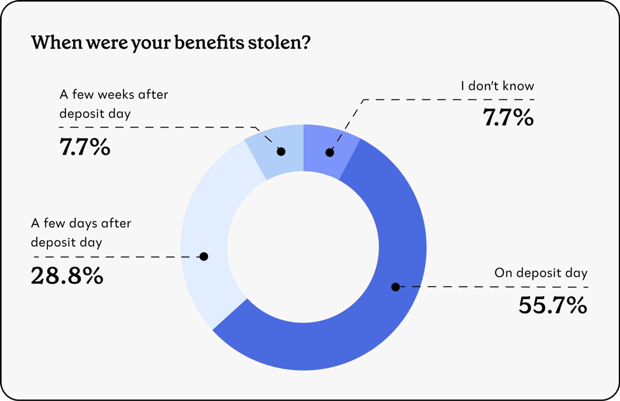 - 43% of EBT theft victims report that their stolen benefits were spent or withdrawn outside of their state, compared to 35% last year