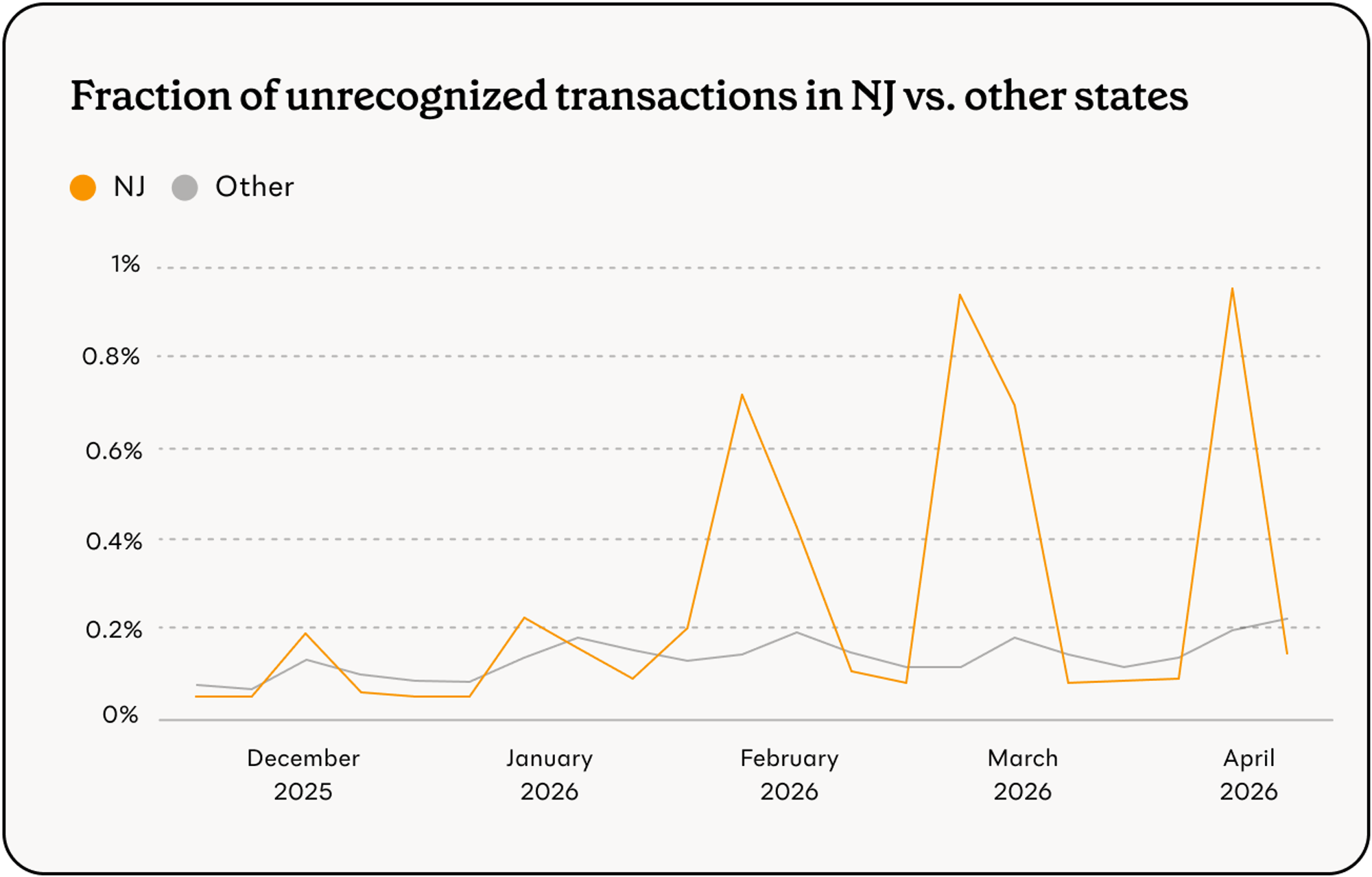 In March, New Jersey’s unrecognized tap rate increased from 0.29% to 0.39%, the highest rate of any state in the month. As in February, the geographic pattern points to skimming: unrecognized transaction rates are concentrated in northern counties near New York City, particularly Hudson, Essex, and Passaic counties.