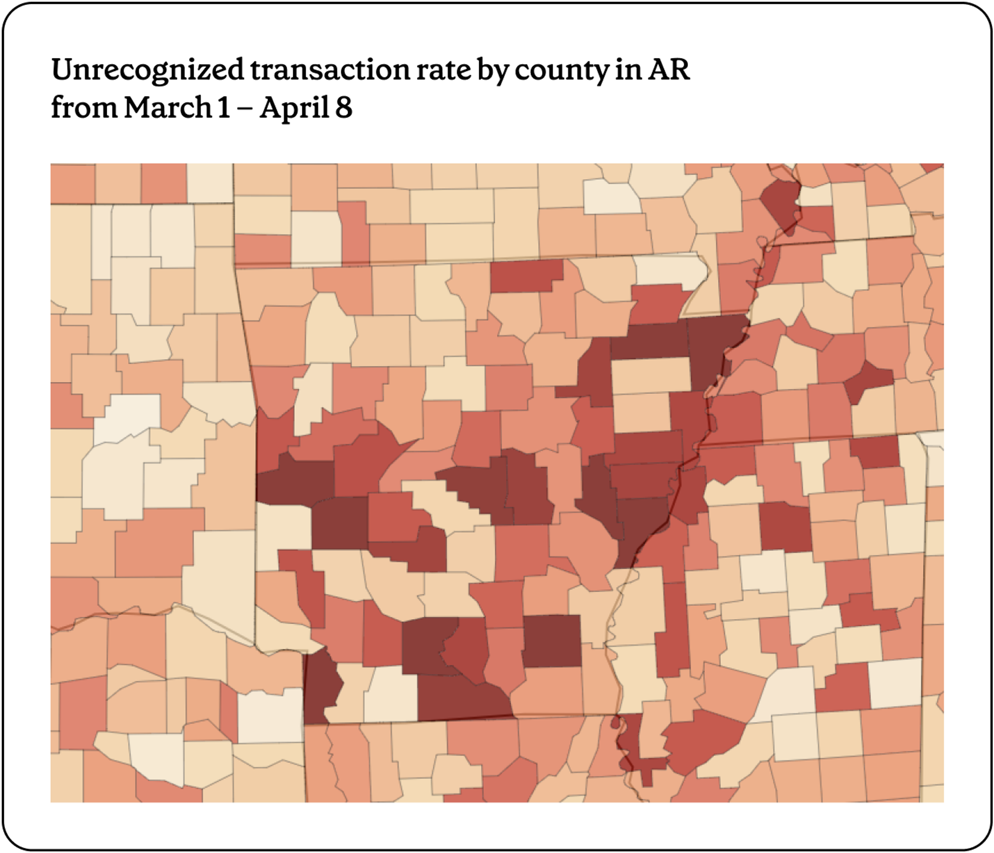 As in previous months, the geographic pattern suggests skimming rather than a statewide data compromise: elevated theft rates are concentrated in certain counties (rather than spread uniformly across the state) and theft seems to bleed over the Eastern border into Tennessee and Mississippi.