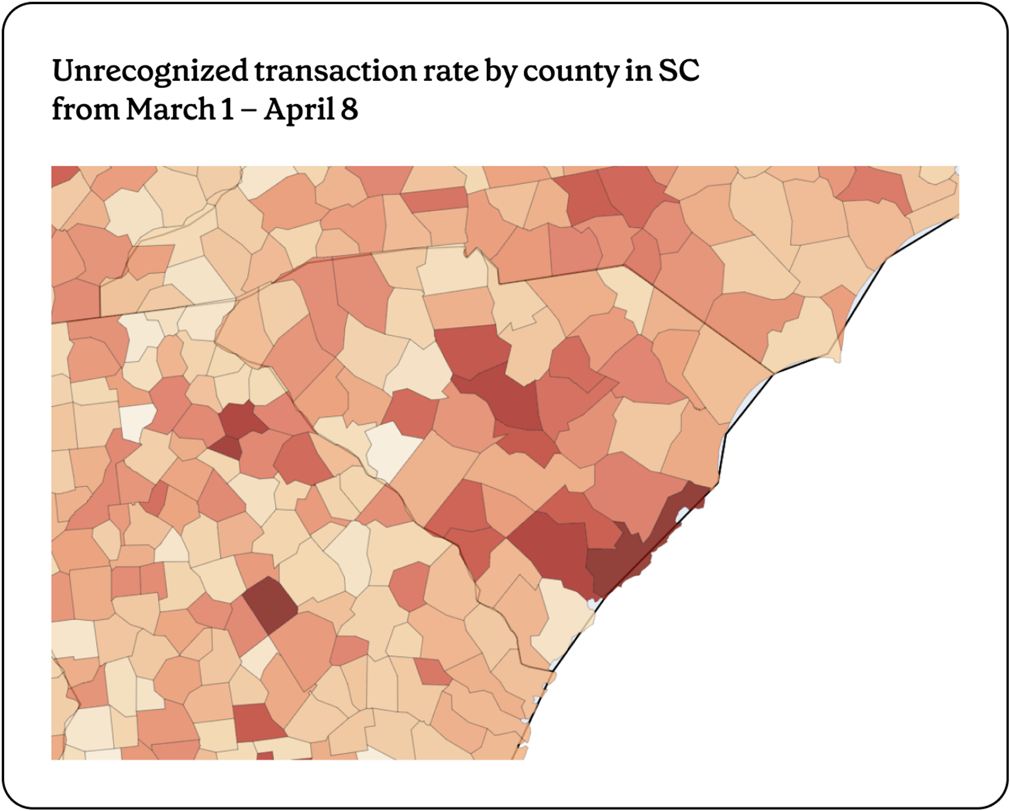 South Carolina entered the top 3 for the first time, with the unrecognized tap rate rising to 0.29% in March. Skimming at specific retail locations is a key vector: four locations of a specific retail chain had future liquidation victim rates above 15%, and 10% of all South Carolina victims shopped at one of these stores prior to liquidation.