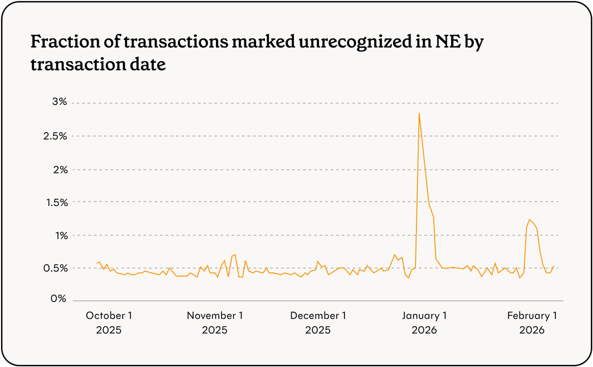 Nebraska saw a large increase in unrecognized transactions from December to January, which has continued into February. These transactions occurred early in the month, in line with Nebraska’s deposit schedule.