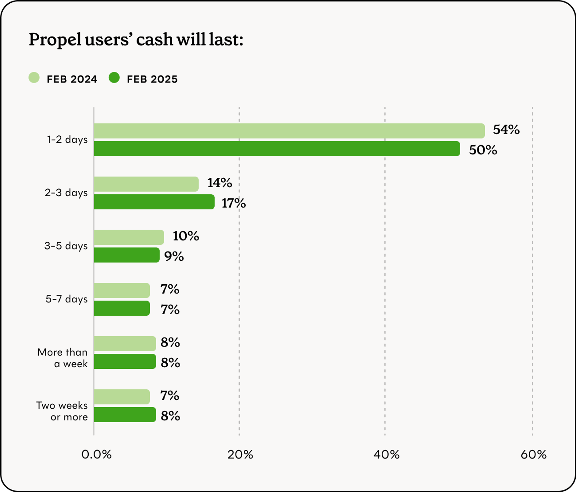 - 50% say this cash will only last them 1-2 days, down slightly from 54% this time last year.
