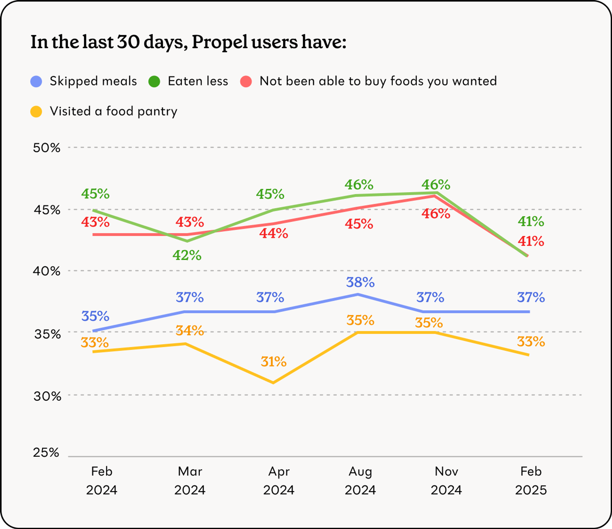 - 37% reported skipping meals, a percentage that has remained constant for a year.