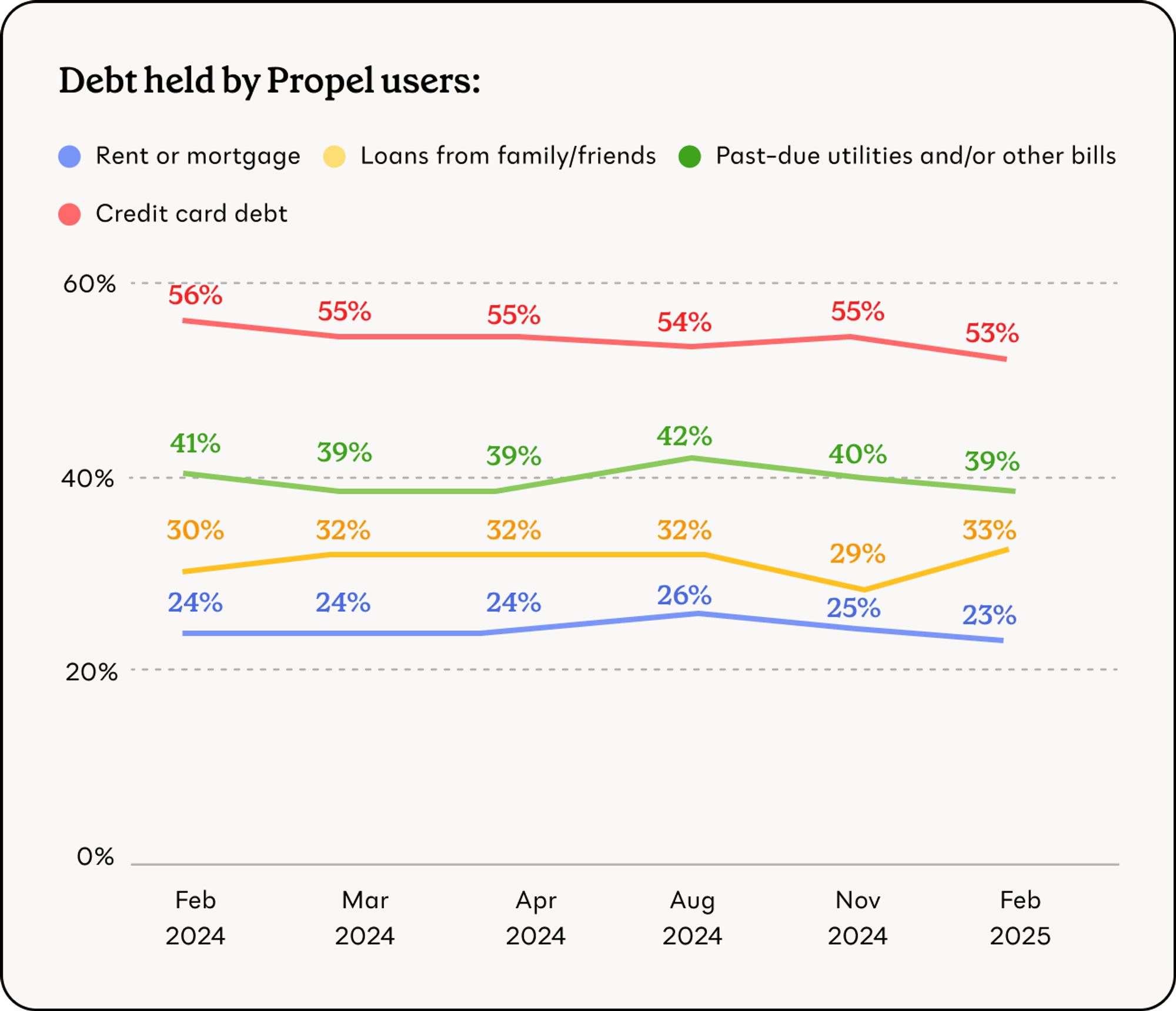 - 53% have credit card debt, close to the average of all months in the survey.