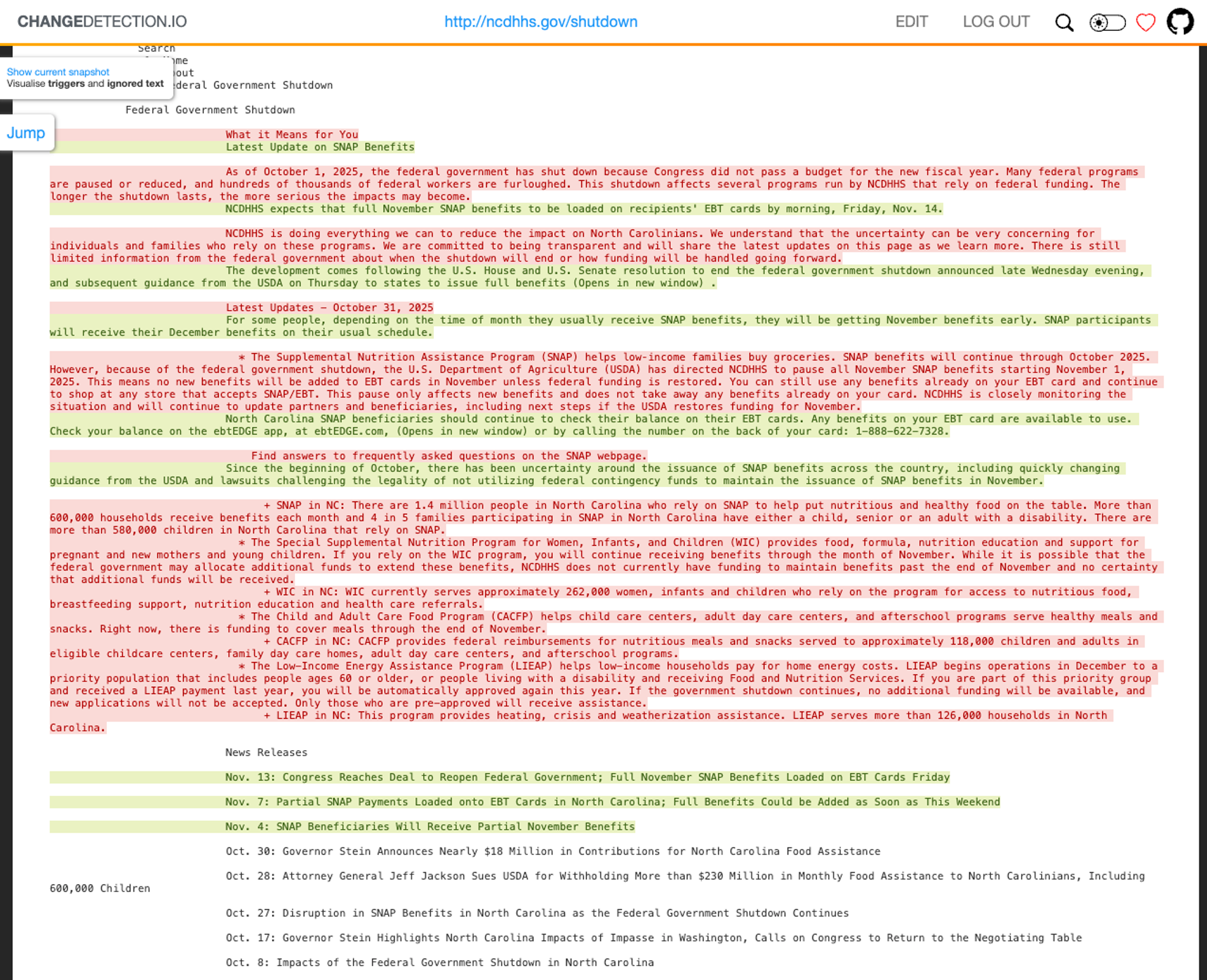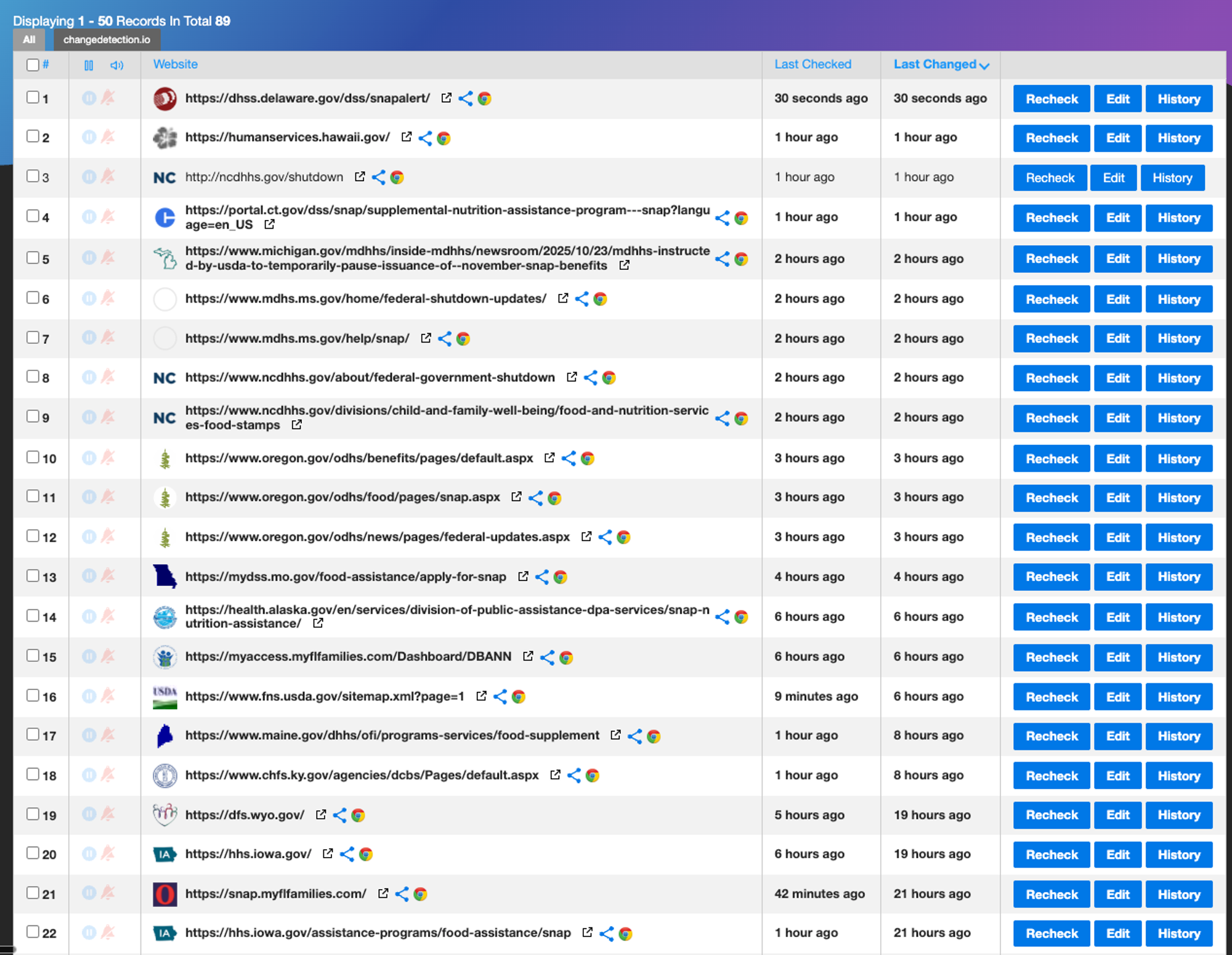 One of our AI residents, Keith Kurson, had work in progress on a system to monitor state SNAP agency websites for new information. This was originally intended to monitor new information that state SNAP agencies put out for clients given the ongoing implementation of major changes to SNAP from the OBBB law passed by Congress in July.