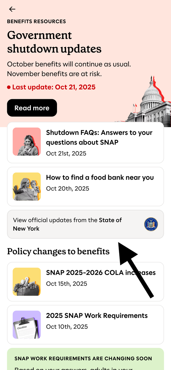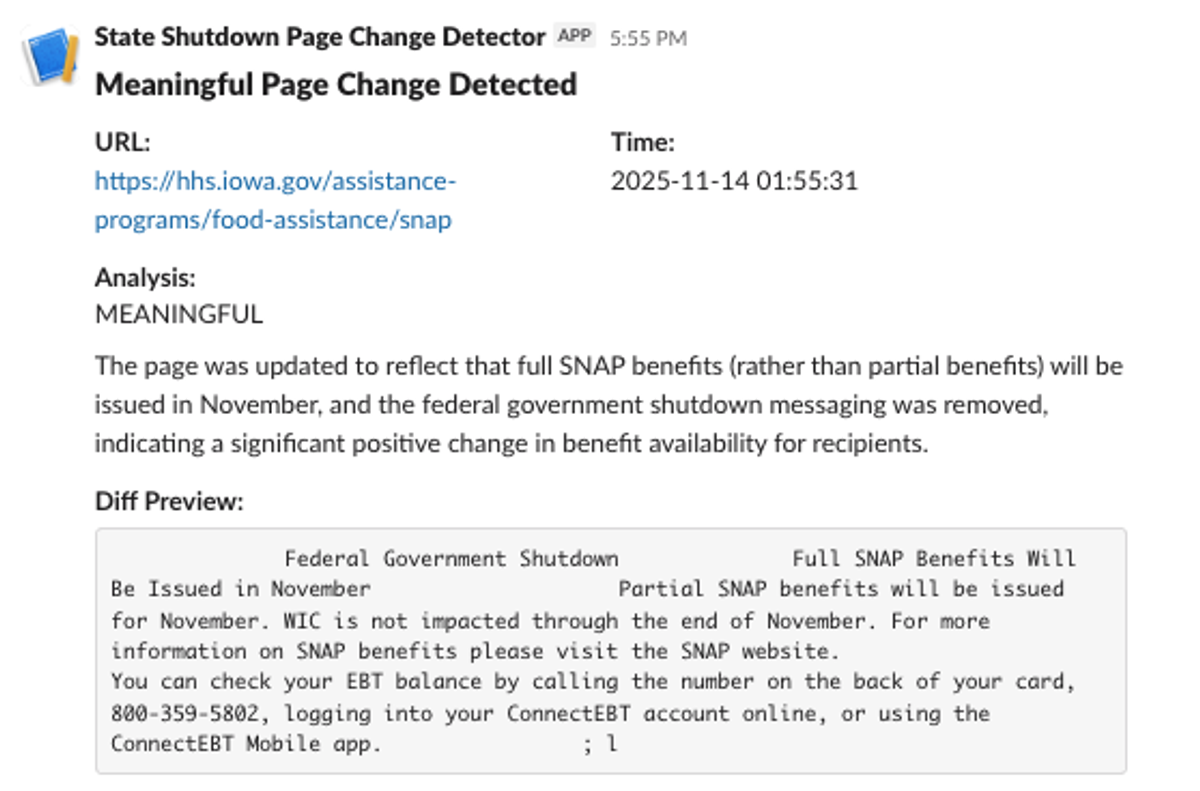 When the government shutdown created mass uncertainty about November SNAP benefits, we quickly repurposed work we had been doing on real-time monitoring of state SNAP agency website updates to get official state messaging out to Propel app users, to get people the most up-to-date information, directly from their state agency.