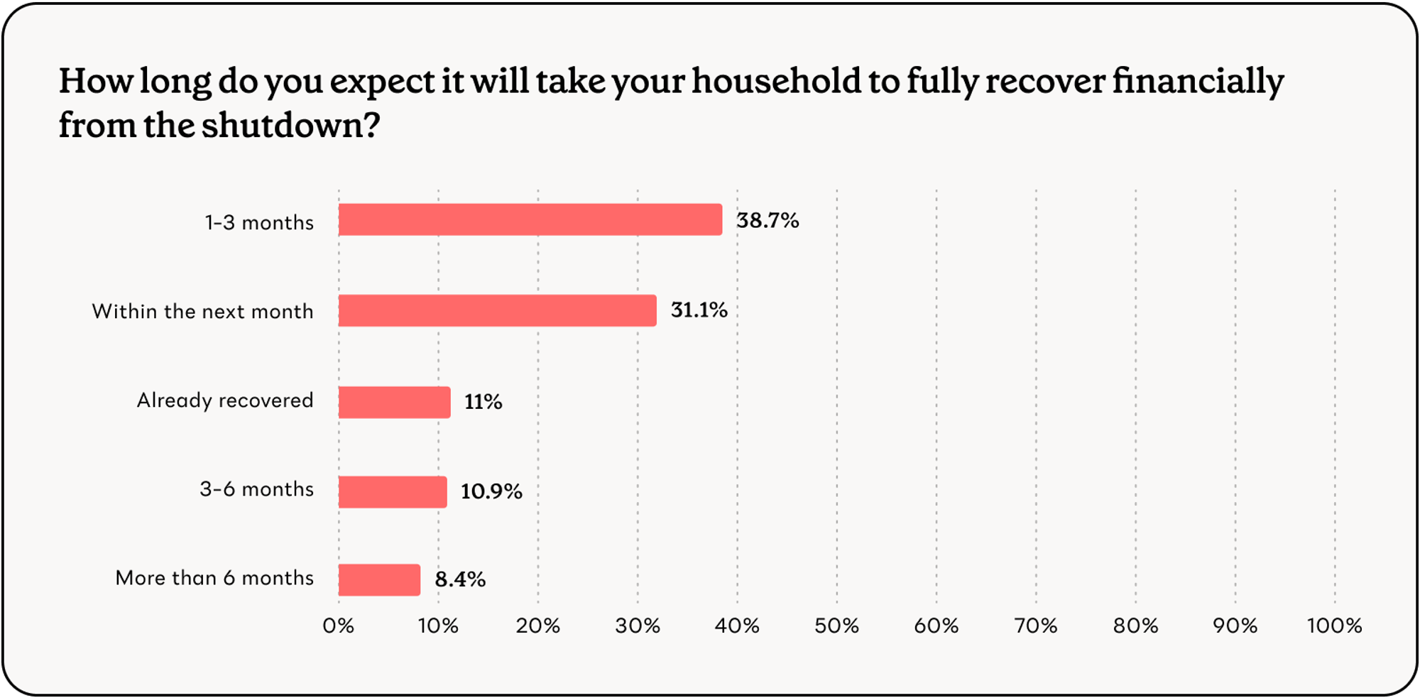 - Nearly 40% say it will take 1–3 months for their household to fully recover financially